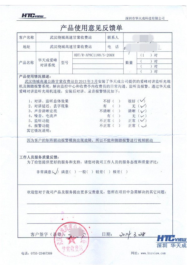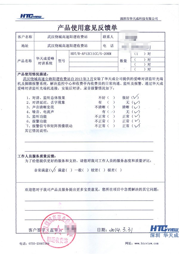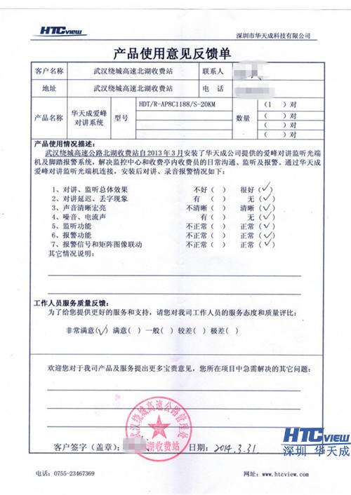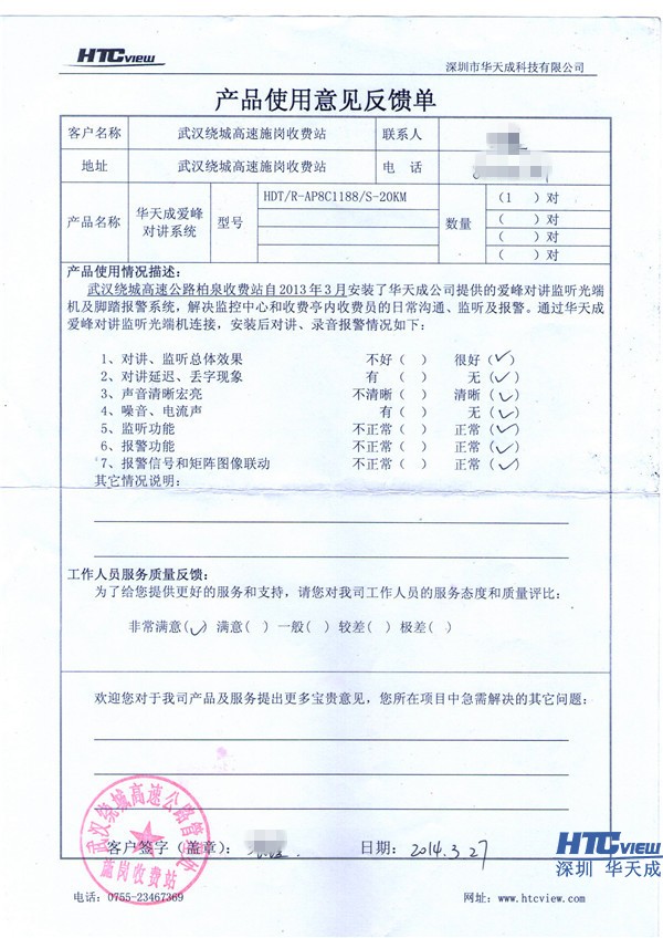 爱峰对讲光端机产品使用意见反馈单:
